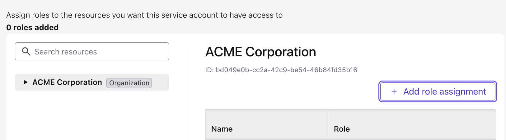 Select the top level Organization in the left sidebar, then click Add role assignment: